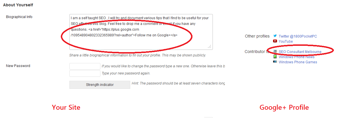 One potential issue you will find is that WordPress will strip out ?rel=author from the link , so you need to install HTML in Author Bio plugin to get the job done. The next step to get this done is to add a reciprocal link back from your Google+ profile to this site. Edit the Contributor To section on your Google+ profile and add the link to your site in there.