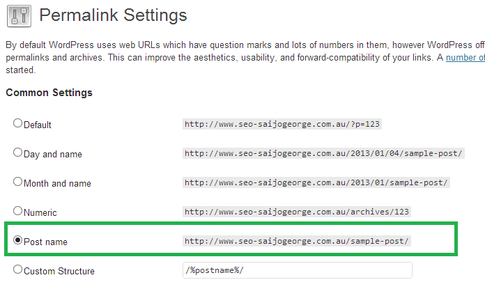 If you have used WordPress, you might have heard the term Permalink (if it’s the first time you have come across that term, think of it as a fancy term for URL structure). By default, WordPress uses an ugly permalink structure that looks like this: example.com/?p=123. Wouldn’t it be much better for SEO and for users if it were example.com/title-of-the-post/?Thankfully, there is an easy way around it, log in to your WordPress Admin interface, and go to Settings >> Permalinks. Here you have the option to change your URL structure. Personally, I go with Postname but you can add Custom Structure in there should you want to do it.